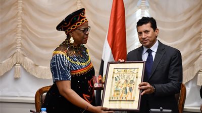 أهدى الدكتور أشرف صبحي- وزير الشباب والرياضة احدى المنتجات اليدوية الحرفية الى لوسيت رينيه الأمين العام لمنظمة الكونفجيس اثنا