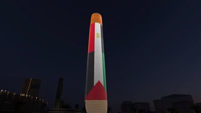 البرج الأيقونى بالعاصمة الإدارية يتزين بعلمى مصر وفلسطين وشعار قمة القاهرة للسلام
