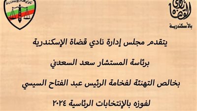هنأ المستشار سعد السعدني رئيس نادي قضاة الأسكندرية سيادة الرئيس عبد الفتاح السيسي بفوزه في الانتخابات الرئاسية 2024.