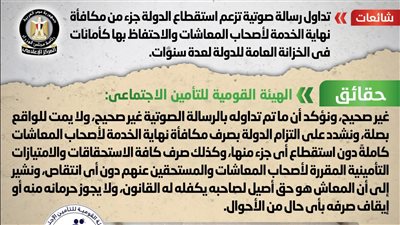 كشف المركز الإعلامى لمجلس الوزراء، أنه فى ضوء ما تم تداوله من رسالة صوتية تزعم استقطاع الدولة جزء من مكافأة نهاية الخدمة لأصحاب المعاشات والاحتفاظ بها كأمانات فى الخزانة العامة للدولة