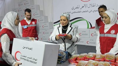 تفقدت السيدة انتصار السيسي - حرم الرئيس عبد الفتاح السيسي- جهود الهلال الأحمر المصري لدعم الأشقاء في غزة.