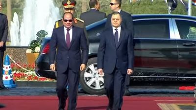 وضع الرئيس عبد الفتاح السيسي فور وصوله لأكاديمية الشرطة لحضور حفل عيد الشرطة، إكليلاً من الزهور على الن