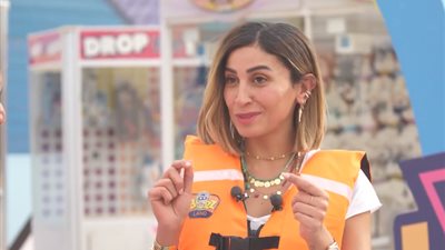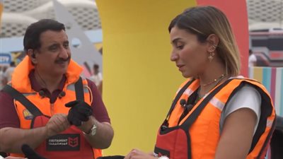 ألقى فريق عمل برنامج "رامز عقله طار" الفنانة دينا الشربيني من كبسولة "الهوب دروب" بحمام السباحة بسبب خوفها