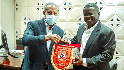 أهدى المهندس خالد الدرندلي، أمين صندوق النادي الأهلي، رئيس بعثة الفريق الأول لكرة القدم في السودان، درع وعلم