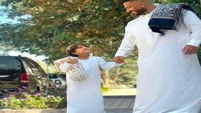 شارك النجم تامر حسني صورة تجمعه بنجله آدم يرتدي الجلباب الأبيض أثناء تأدية صلاة الجمعة وعلق النجم تامر