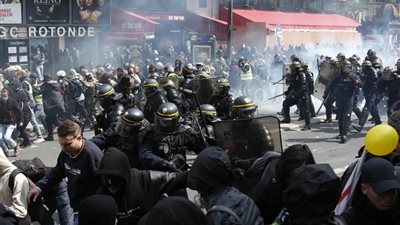 اشتبك متظاهرون ملثمون مع الشرطة في باريس، اليوم السبت، وشارك الآلاف في احتجاجات عيد العمال التقليدية في أنحاء فرنسا