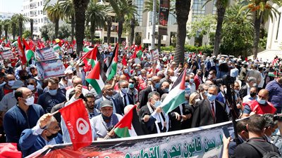 تظاهر مئات التونسين في العاصمة، اليوم الأربعاء، دعماً للأشقاء للفلسطينيين، والمطالبة بالمصادقة على قانون "يجرّم" التطبيع مع إسرائيل