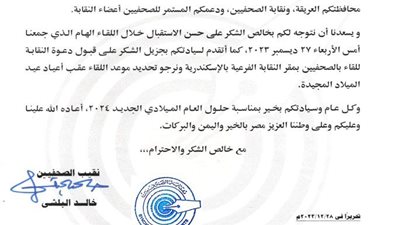 ايماءً للخطاب الوارد من الأستاذ خالد البلشي نقيب الصحفيين، اليوم الخميس الموافق 28ديسمبر 2023، بشأن دعوة محافظ