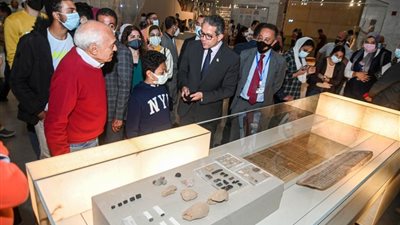 تفقد الدكتور خالد العناني وزير السياحة والآثار ، قاعة العرض المركزي بالمتحف القومي للحضارة المصرية بالفسطاط، والتقي بمجموعة من الأطفال تضم 11 طف