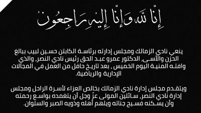 ينعي نادي الزمالك ومجلس إدارته برئاسة الكابتن حسين لبيب ببالغ الحزن والأسى، الدكتور عمرو عبد الحق رئيس