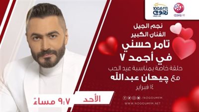 يحل النجم تامر حسني ضيف برنامج "أجمد 7" مع جيهان عبد الله على إذاعة "نجوم اف ام"، في حلقة خاصة يوم عيد الحب.