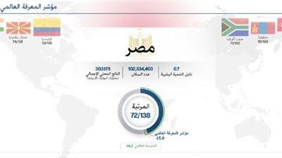 حقَّقت مصر، أداءً متقدماً ضمن المتغيرات الفرعية لـ "مؤشر المعرفة العالمي 2020"، الذي أطلقته مؤسَّسة