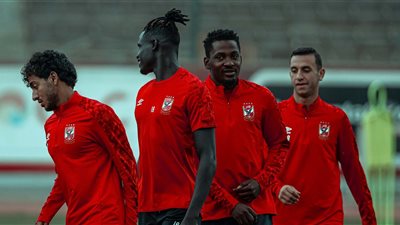 انتظما جونيور أجايي وأليو بادجي، لاعبا الفريق الأول لكرة القدم بالنادي الأهلي، في التدريبات الجماعية التي أقيمت مساء اليوم على ملعب التتش.