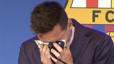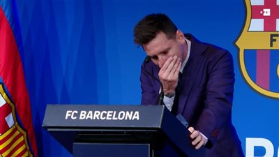 بكى الأسطورة الأرجنتنية ليونيل ميسى قائد فريق برشلونة الإسبانى خلال مؤتمر الوداع الذى يقام فى مقر النادى عقب رحيله عن النادى