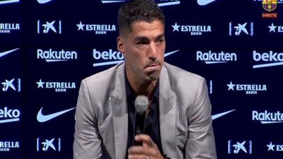 ظهر المهاجم الأوروجوياني لويس سواريز نجم برشلونة السابق، في مؤتمر الوداع بعد رحيله عن النادي الكتالوني متجهًا لصفوف أتلتيكو مدريد في صفقة انتقال حر بعد ست سنوات قضاها في صفوف "البلوجرانا".