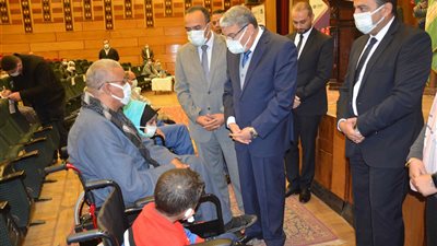سلم اللواء أسامة القاضي، محافظ المنيا، بحضور نائبه الدكتور محمد أبو زيد، عددا من الأجهزة التعويضية للمستحقين من