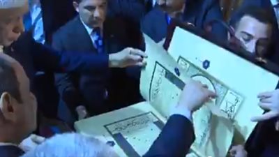 قدّم الرئيس التركي رجب طيب اردوغان لنظيره المصري عبد الفتاح السيسي، نسخة من المصحف الشريف هي طِبق الأ
