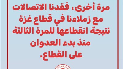 أعلن الهلال الأحمر الفلسطيني قبل قليل، عن أن الاتصالات انقطع مع موظفيه في قطاع غزة، للمرة الثالثة منذ بدء العدوان على غزة، في السابع من أكتوبر الماضي.