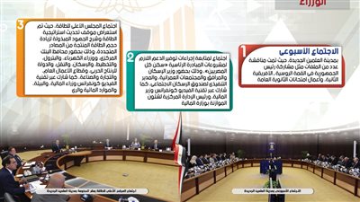 نشر المركز الإعلامي لمجلس الوزراء، تقريراً شمل إنفوجرافات سلط من خلالها الضوء على الحصاد الأسبوعي لمجلس الوزراء
