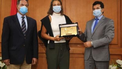 اناب دكتور أشرف صبحي وزير الشباب والرياضة ، مساعده دكتور عمرو الحداد لاستقبال ميار شريف بطلة مصر في التنس وفتاة مصر الذهبية غداً السبت والتي تصل الي مطار القاهرة الدولى