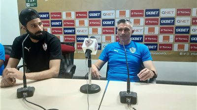 عقد الفرنسي باتريس كارتيرون المدير الفني للفريق الأول لكرة القدم بنادي الزمالك، جلسة مع اللاعبين قبل انطلاق.
