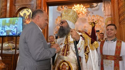 شهد اللواء عصام سعد محافظ أسيوط،قداس عيد القيامة المجيد بمطرانية الأقباط الارثوذكس بأبنوب، مقدماً التهنئة للأنبا بيسنتى
