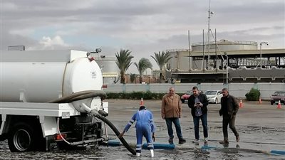 تنفيذاً لتوجيهات اللواء عبد المجيد صقر محافظ السويس باستمرار أعمال كسح المياه من الشوارع بالأحياء بمشاركة الشركات والشركة