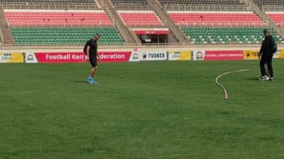 تفقد الفرنسي باتريس كارتيرون المدير الفني للفريق الأول لكرة القدم بنادي الزمالك أرضية ملعب نيايو الوطني في العاصمة الكينية نيروبي