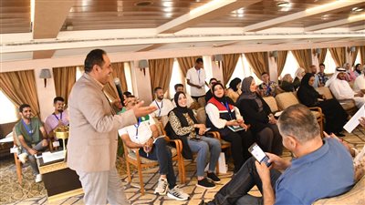 تناقش شباب الوفود العربية بورشة عمل حوارية تفاعلية حول التطوع الابتكارى والابداعى، ضمن فعاليات مشروع سفينة النيل للشباب العربى، والذى تنظمه وزارة الشباب والرياضة المصرية
