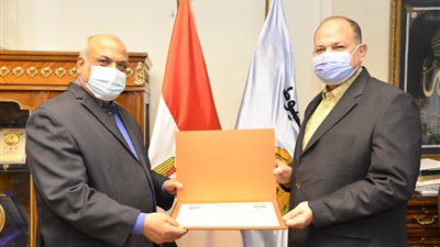 كرم اللواء عصام سعد محافظ أسيوط المهندس مصطفى عبد الفتاح مدير منطقة هيئة الابنية التعليمية بأسيوط تقديرا لجهوده
