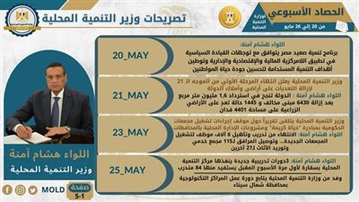أصدر المركز الإعلامي، التابع لوزارة التنمية المحلية، الانفوجراف الأسبوعي في نسخته الـ 34 حول حصاد أهم