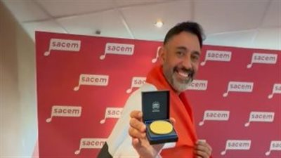 عمرو مصطفى يرفع علم مصر أثناء تكريمه من جمعية المؤلفين والملحنين العالمية
