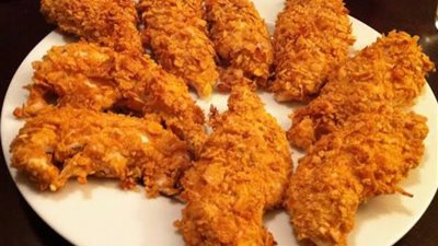 الدجاج المقرمش وصفه شهيه ومناسبه لجميع الأعمار وهي عبارة عن قطع دجاج متبلة بالبهارات والحليب مغمسة بالكورن فليكس مقليه في الزيت.